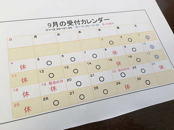 9月は少し通常と異なる受付カレンダーとなっておりますので、ご注意ください。
